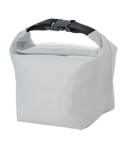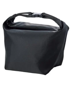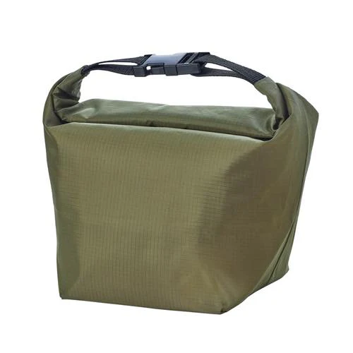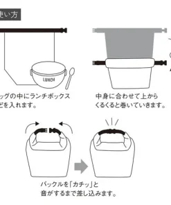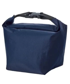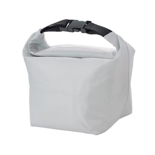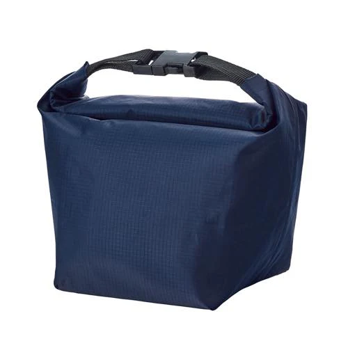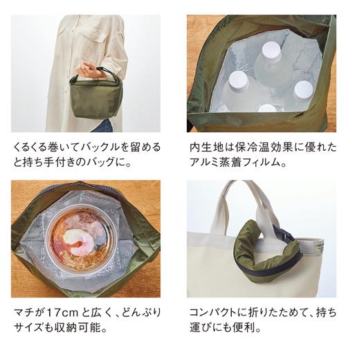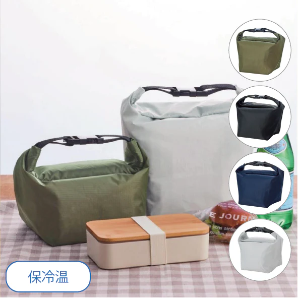 上部をくるくる巻いてカチッと留めるだけで簡単に閉められて持ち運び用のハンドルにもなる保冷温ランチバッグです。内生地は保冷温効果に優れたアルミ蒸着フィルム。